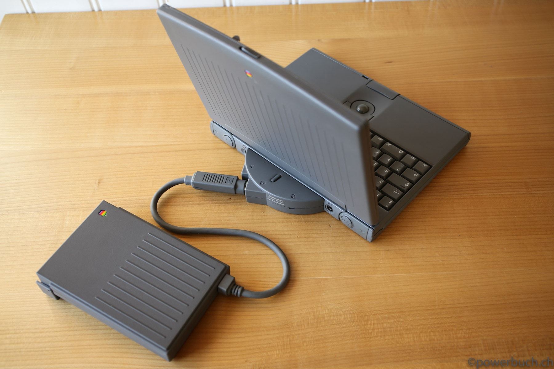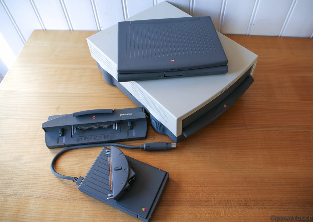 The first of a new class, the idea behind the duo 210 was to have a fully functional desktop computer (by way of the duodock) that also served as an excellent portable machine. The 210 ran on a 25 MHz 68030 processor, had a 4-bit passive screen, 4-32 MB of memory, and an internal hard drive. Its most innovative feature was the 152 pin PDS that allowed it to dock with a docking station that might contain more RAM, a larger hard drive, or more VRAM for a color monitor. The idea behind the powerbook duo is similar to the idea behind the macbook air and “ultrabooks” – trade high-end performance, expandability, and connectivity for improved portability and battery life. Members of the duo series share several common attributes that allowed apple to reduce their thickness and weight by almost 40% compared to the powerbook 100 series. To do this, apple omitted the floppy drive, limited the screen size to nine inches, included a smaller keyboard, and limited ports to three – one dock, one serial, and either a modem or adb. An additional goal of the duo was to prevent laptop owners from having to buy a dedicated desktop machine to use when they were not on the road. All duo models include a large dock connector on the back, nothing more than an external version of the pds slot introduced on the macintosh lc, that can connect to one of several docks or adapters. There is a full-sized dock that includes a floppy drive, an additional hard drive, additional ports, additional video memory, and supports an external monitor. This could be setup in the user’s office as a stationary workstation with a large color monitor, keyboard, and mouse. There is also a smaller dock that only includes extra ports such as scsi, video out, sound out, adb, and serial ports. There are also adapters that offer connectivity to specific things such as scsi or apple’s external floppy drive.